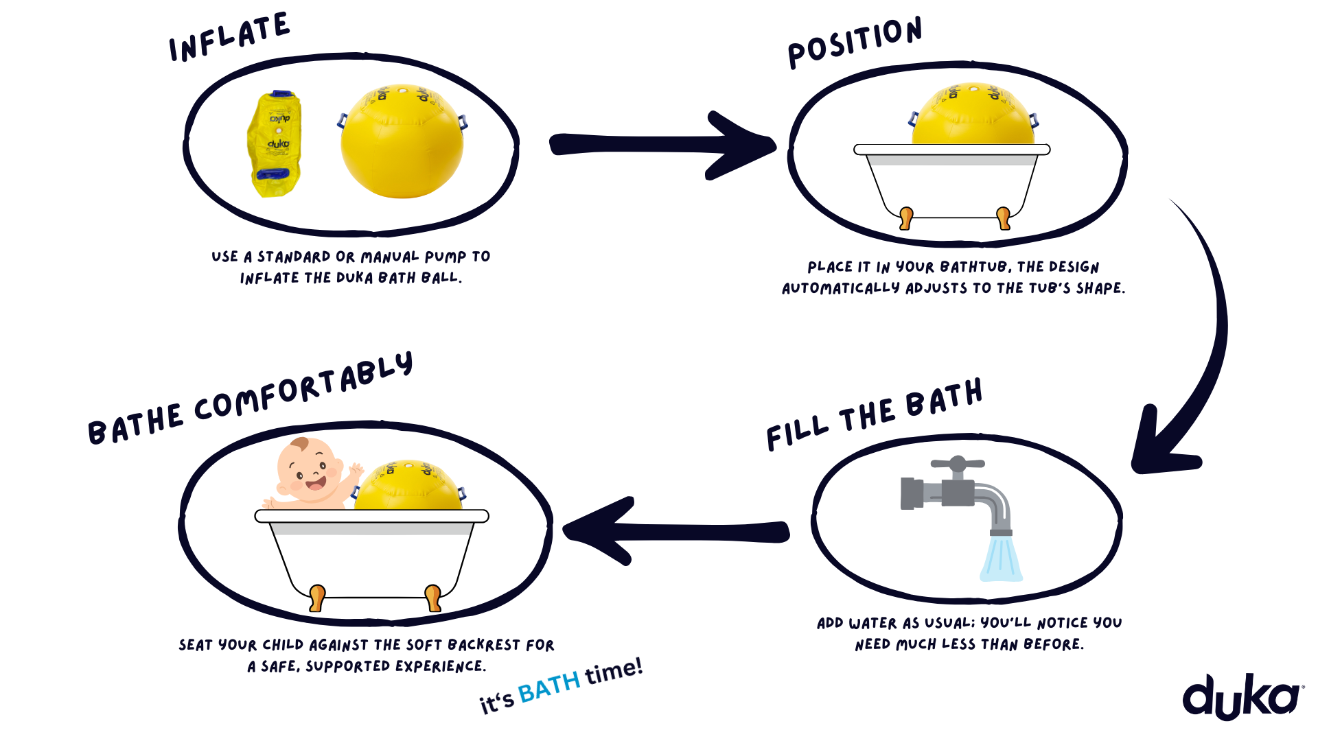 The Duka Bath Ball is an innovative inflatable accessory designed to reduce bath water usage while enhancing comfort. Its soft, pliable backrest and two adjustable water compartments allow it to conform perfectly to most standard baths, providing ergonomic support. Lightweight when inflated, it also covers the bath plug to prevent leaks. Made from child-safe materials, the Duka Bath Ball offers a practical, environmentally conscious solution for families seeking to save water without sacrificing comfort.